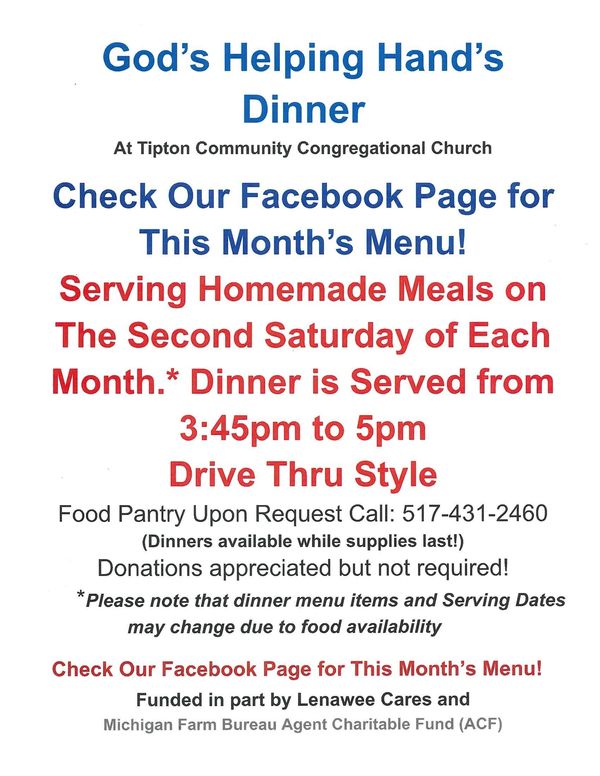 Our Second Annual Tipton Community Church Garage Sale will be on Saturday , August 23. Donations are gratefully accepted and all funds go to supporting this ministry! Please watch this space for further Details!